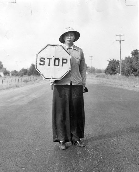 Our assignment was Highway 218…mile upon flat mile upon flat mile of cornfields. We’d drive out there at daybreak. I’d stand at one point on the road. Amy would stand down the road at another point, a just visible dot. Patty was out there somewhere, beyond my line of vision. We’d stand and stand and occasionally get to flip the sign from stop to slow. Then stand and stand. It was never clear where or when or if we were supposed to pee.