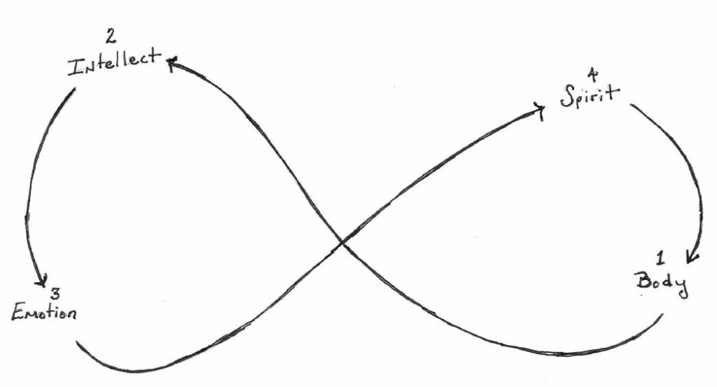 Knowing each cornerstone has a location in the brain and that when we are coming undone it’s because our cornerstones have lost their unifying connection with each other makes the process of pulling them back together pretty simple, conceptually. In the first level of the process, re-connecting our parts simply involves touching base with each one, a circuit that begins with your Body, crosses up and over to your Intellect, drops down to your Emotion and crosses back over and up to your Spirit.